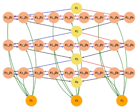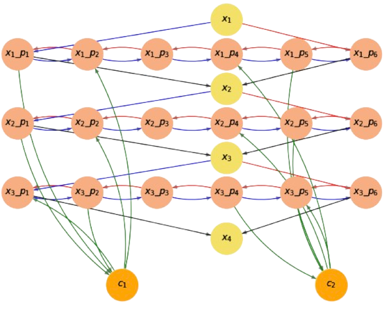 Since \(x_1\) is ‘positive’ (True) in \(c_1\), we must make \(x_1\rightarrow x_1\_p_1\), then go to \(c_1\) using a ‘green’ edge clause and then come back to this path through \(c_1\rightarrow x_1\_p_2\). This way, we may proceed towards the right through \(x_1\_p_3\).
