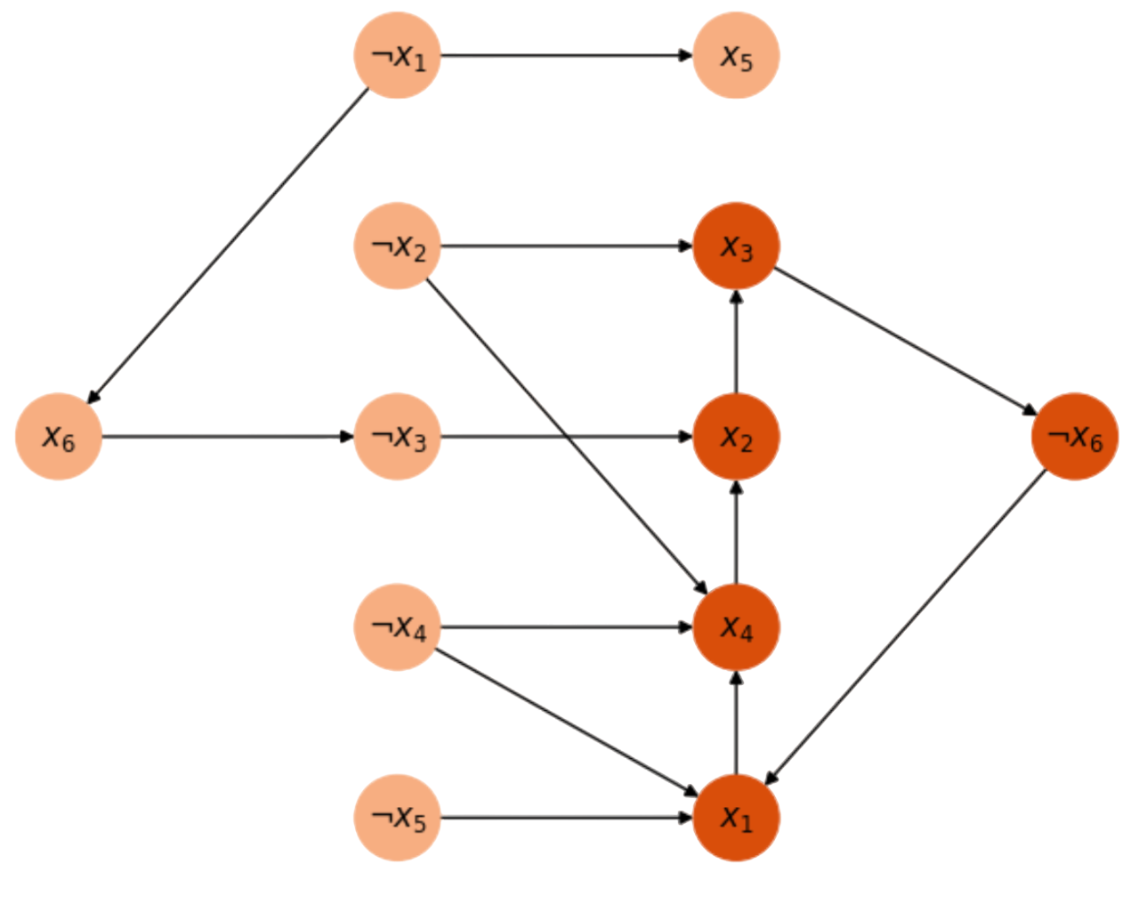 Firstly, two nodes \(i,j\in V\) are strongly connected if there exists a directed path \(\Gamma_{ij}\) connecting them. For instance, in Fig. 1.1, \(i=x_2\) and \(j=x_1\) are strongly connected since we have \(\Gamma_{ij}=\{i=x_2\rightarrow x_3\rightarrow \neg x_6\rightarrow x_1=j\} \). Actually all the nodes in dark orange belong to the same strongly-connected component \(C_8=\{x_1,x_2,x_3, x_4,\neg x_6\}\). In short, we can visit all the nodes in \(C_8\) starting from any of them.