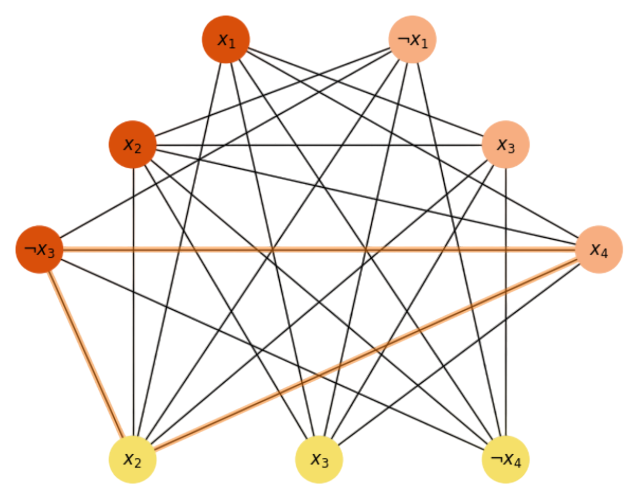 which does not need any transformations since all the clauses have \(3\) literals yet. The nodes corresponding to the same clause are have the same color. Note that the literal \(x_3\) leads to \(2\) diferent nodes (orange and yellow clauses) and it appears negated in the red clause. Overall, the wff is satisfiable if and only if there is a group of \(c=3\) nodes mutually inter-connected, such as \(\neg x_3\), \(x_4\) and \(x_2\). Such a group of nodes forms a complete subgraph \(K_c\) or clique whose order is \(c\).