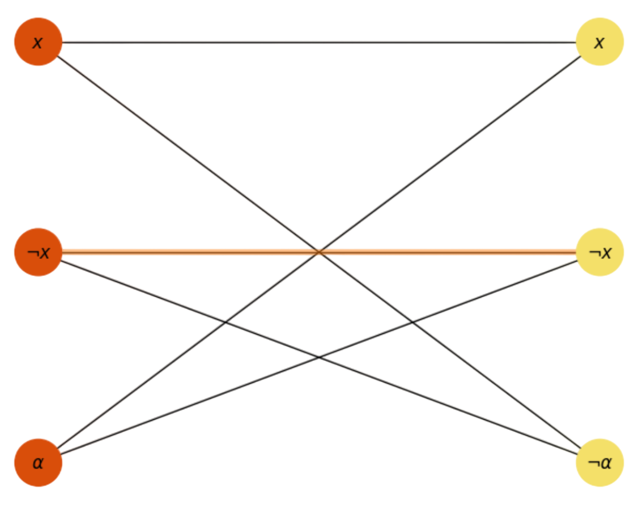 E &=\{(x^1,x^2),(x^1,\neg x^2),(x^1,\neg\alpha_1)\}\cup \{(\neg x^1,x^2),(\neg x^1,\neg x^2),(\neg x^1,\neg\alpha_1)\} \cup \{(\alpha_1,x^2),(\alpha_1,\neg x^2)\}\\