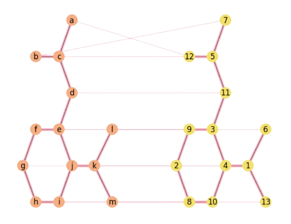 Notable vertices. In the above table, note that MCS assignments usually contain pairwise matchings between nodes with large degrees (notable vertices) in both graphs, namely \(\mathbf{b}\) and \(\mathbf{1}\) or \(\mathbf{4}\) (in bold). These matchings are \(\mathbf{(b,1)}\) and \(\mathbf{(b,4)}\).