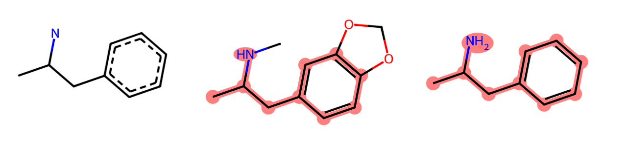 Fig. 2.2 Maximal Common Substructure (left) of two design drugs (center and right).#