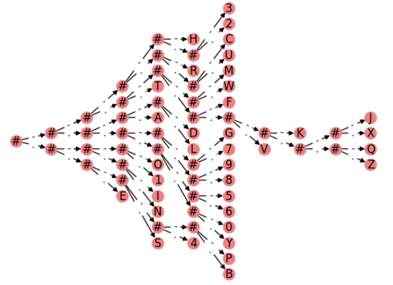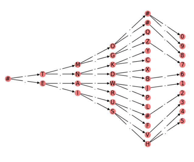 For the Morse code, \(E_{Morse}(l)=3.0794539323542267\). Now, the tree in Fig. 2.29 is built under the constraint of placing more probable letters in the top of the (binary) tree. In other words, we may assume that