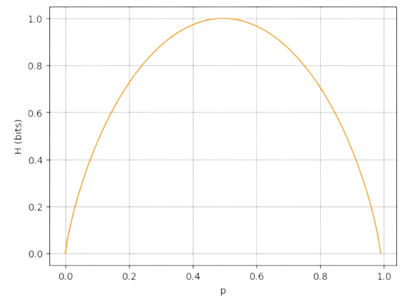 Therefore, the maximal entropy (uncertainty) of a Bernouilli variable is when \(p=q=1/2\) (for instance the probability of a fair coin):