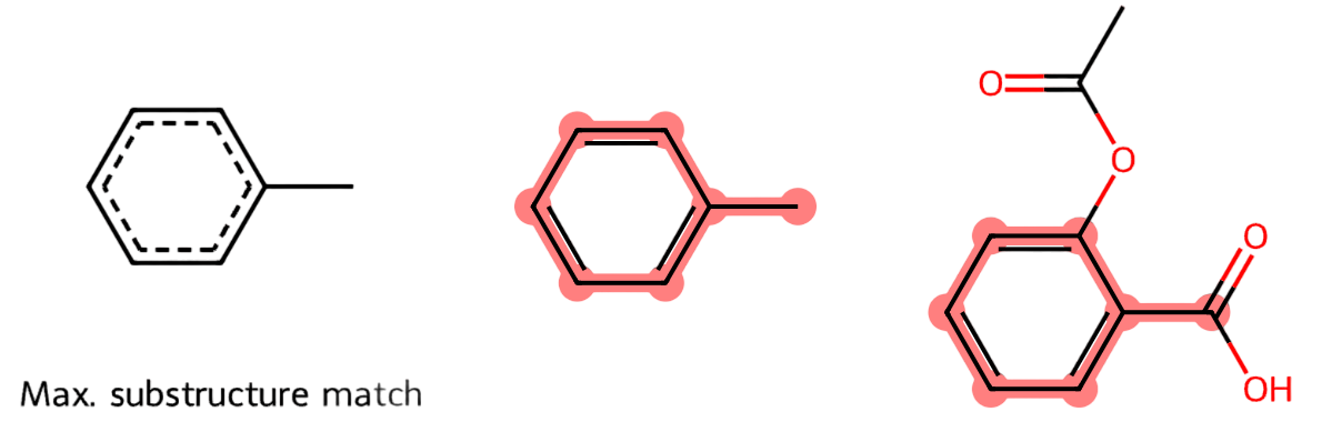 MCS. Comparing substructures is not an easy problem. Whereas comparing substrings is polynomial, comparing substrutures is a well-known NP problem called the Maximum Common Subgraph or MCS: