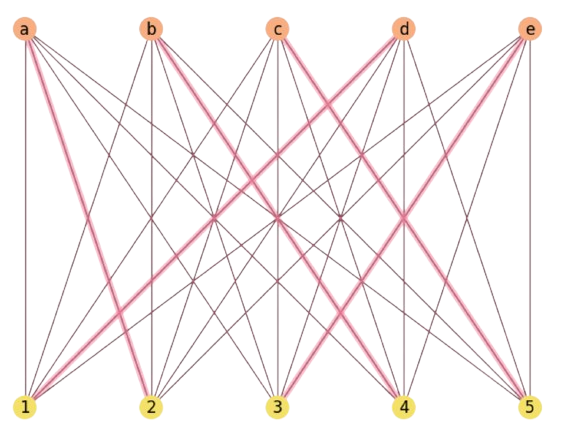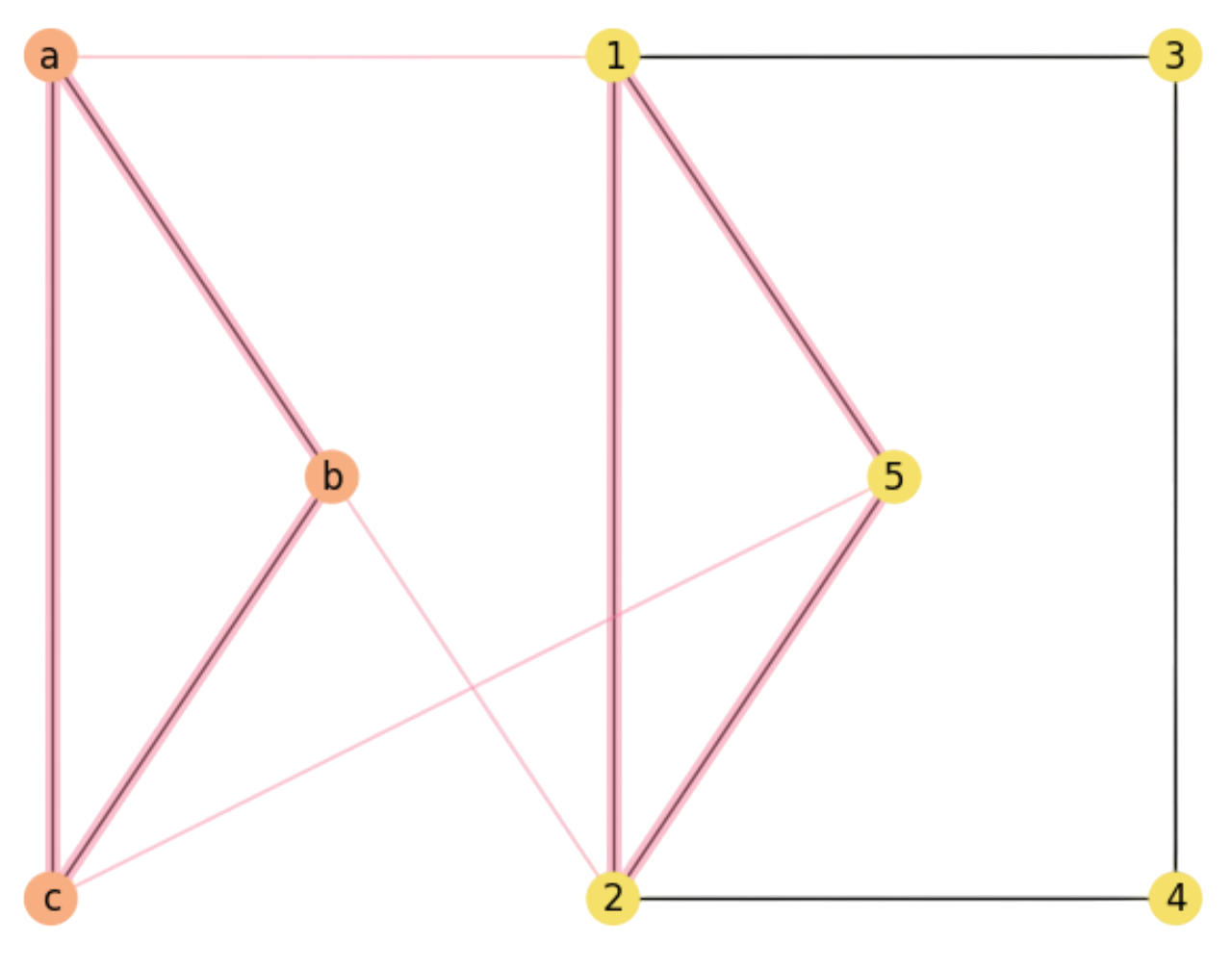Fig. 2.8 Two \(3/4\) matching paths \(b\rightarrow a\rightarrow 1\rightarrow 4\) and \(b\rightarrow c\rightarrow 5\rightarrow 4\).#