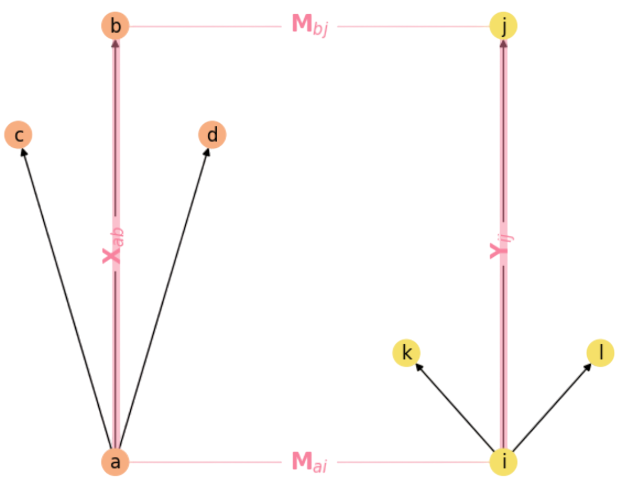 where it is significant the \(2\) paths of \(((\mathbf{X}\mathbf{M})\mathbf{Y})_{b4}\) between nodes \(b\in V\) and \(4\in V'\) (see Fig. 2.8):