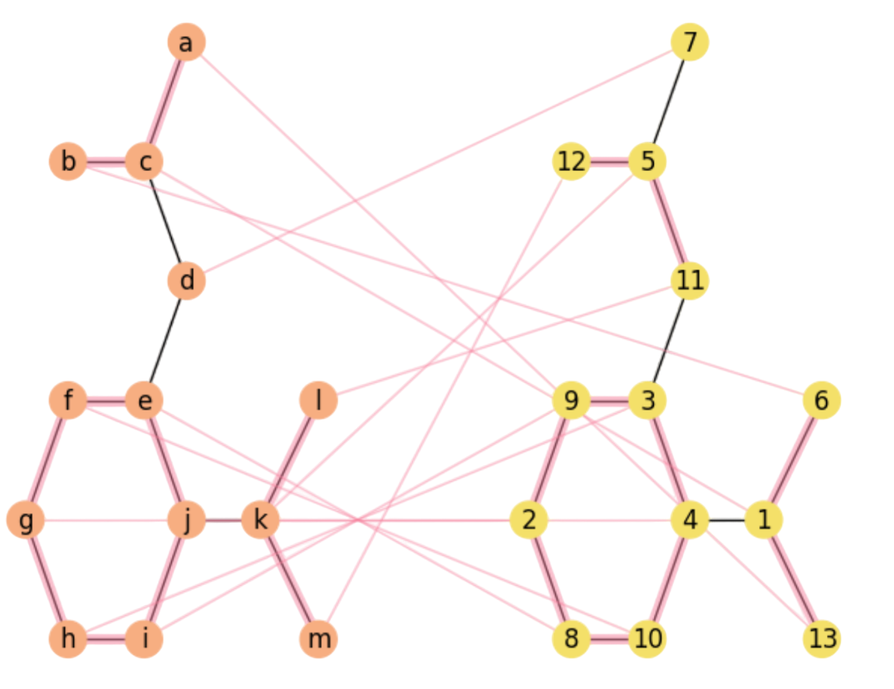 As we can see, \((a,b)\in E\) and \((1=f(a),2=f(b))\in E'\). However, for the other edge \((b,c)\in E\) we have that \((2=f(b),3=f(c))\not\in E'\): As a result \(X\) and \(Y\) do only have one common edge for \(f\) (in magenta).