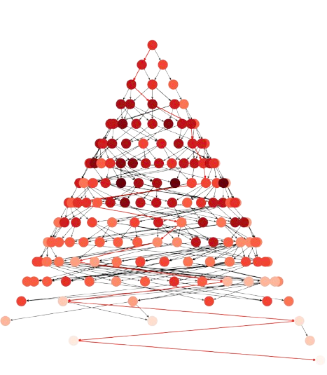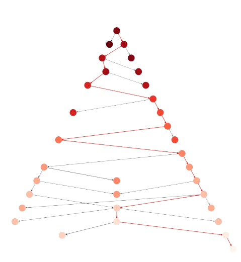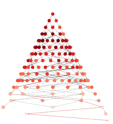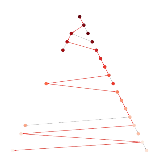 where almost \(300\) nodes are expanded, i.e. selected according to Step 2.1. The backpointers from \(\mathbf{n}_F\) to \(\mathbf{n}_0\) are shown in red and the intensity of the node is the value of the heuristic \(h(\mathbf{n})\) (the larger the higher) as we see in the next section.