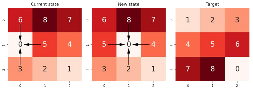 As we see in Fig. 3.2, moving the space is equivalent to a more human-mind way of moving one of the up to \(4\) adjacent tiles to fill the space. In the example, we move from the current-state from the next-state by moving the \(0\) left, i.e. by moving the \(5\) right.