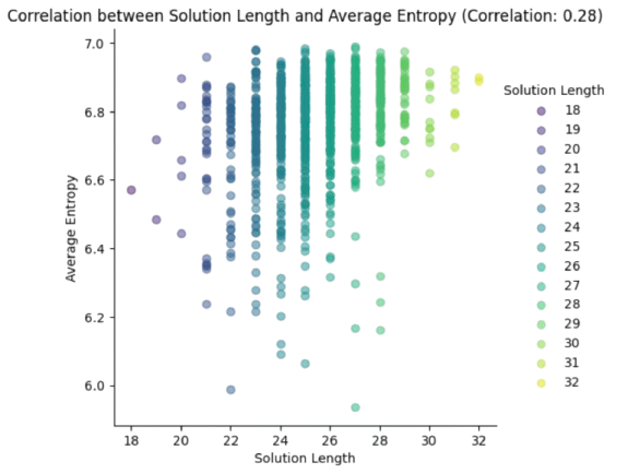There is a slight positive correlation (0.28) between solution length and average entropy. The largest the required length the largest (and less diverse) the entropy.