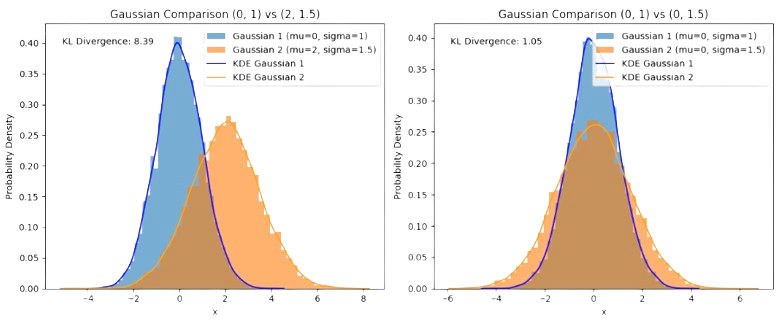 In Fig. 3.17, we explore the two cases (similar vs different mean). Note that co-centering the distributions while preserving the variances reduces dramatically the KL divergence.