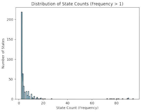 The states in \(\Omega'\) almost distributed uniformly. Actually, most of them are visited once: \(23,201\) of \(23,644\) (\(98\%\)). However, the remaining \(2\%\) show that \(\Omega'\) follows a power law (see Fig. 3.12).